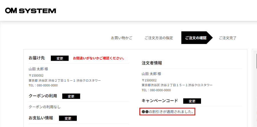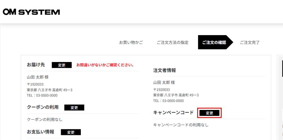 ④「ご注文確認」にて「キャンペーンコード」の変更をクリック