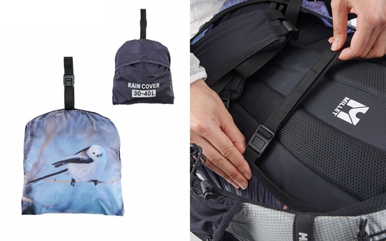 雨の日の行動をもっと楽しくしてくれるレインカバー。30L~40Lを想定したレインカバーに、自然写真のオリジナルプリントを施したモデル。耐水圧2,000mmの素材にシームシーリングを施し、背面にはザックにフィットさせ、風で飛ばされないようにするコンプレッションストラップを装備しています。軽量でコンパクトな点も魅力です。