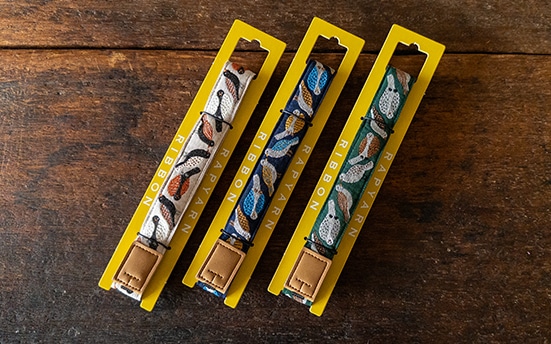 リボンのデザインは、テキスタイルデザイナーのKAYO AOYAMAさんとのコラボチロルリボンです。