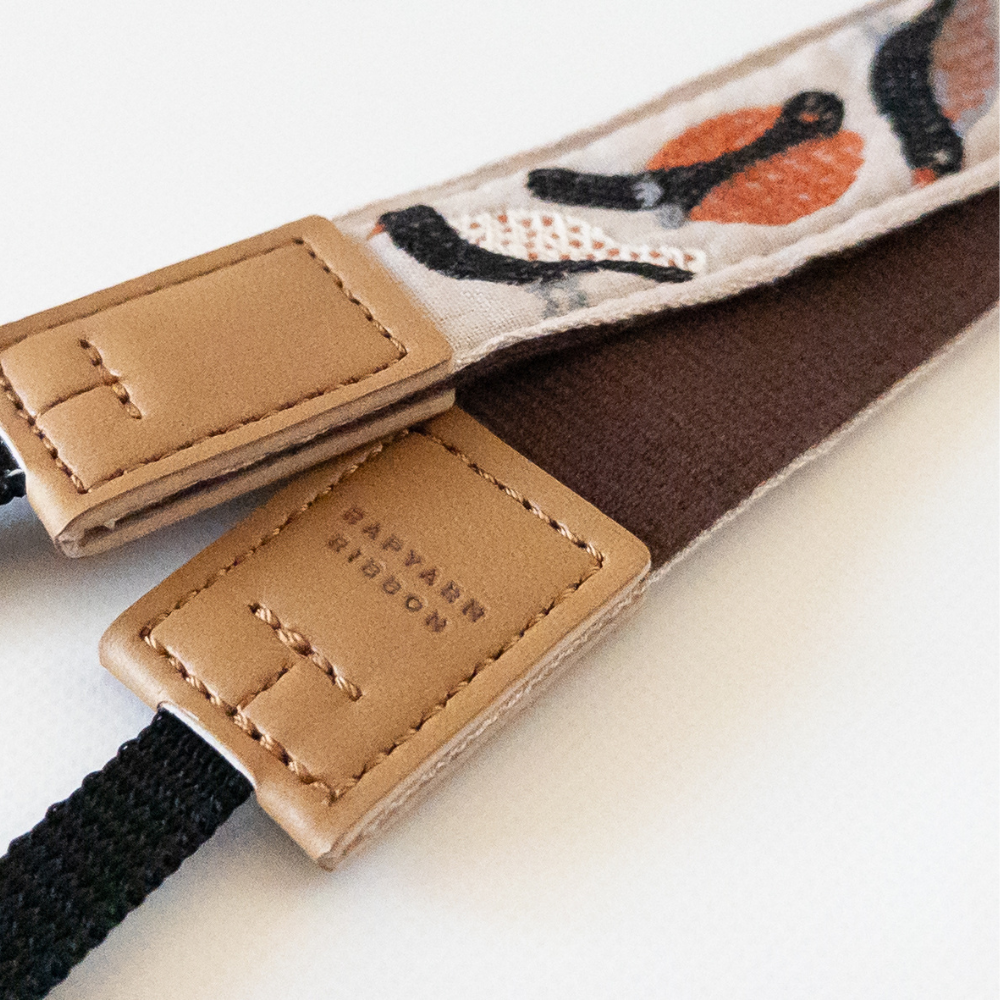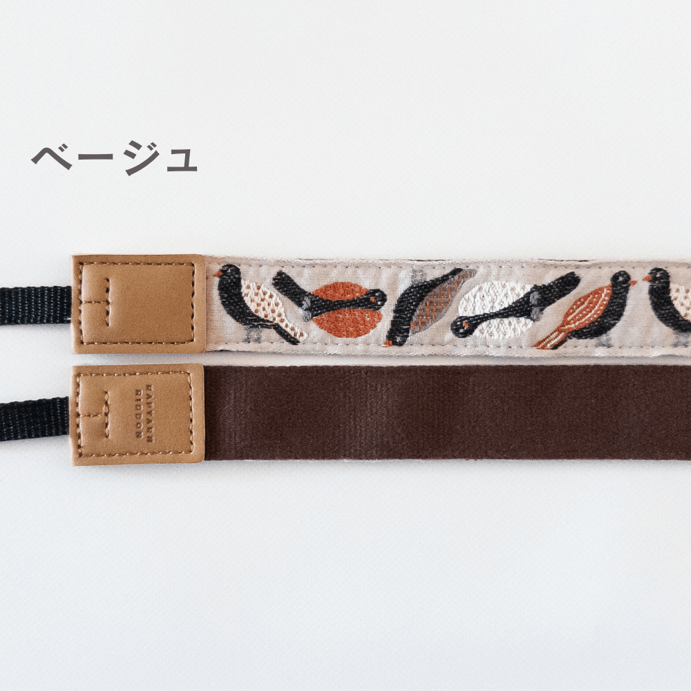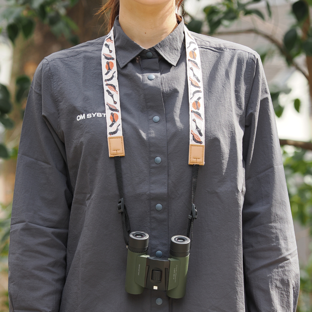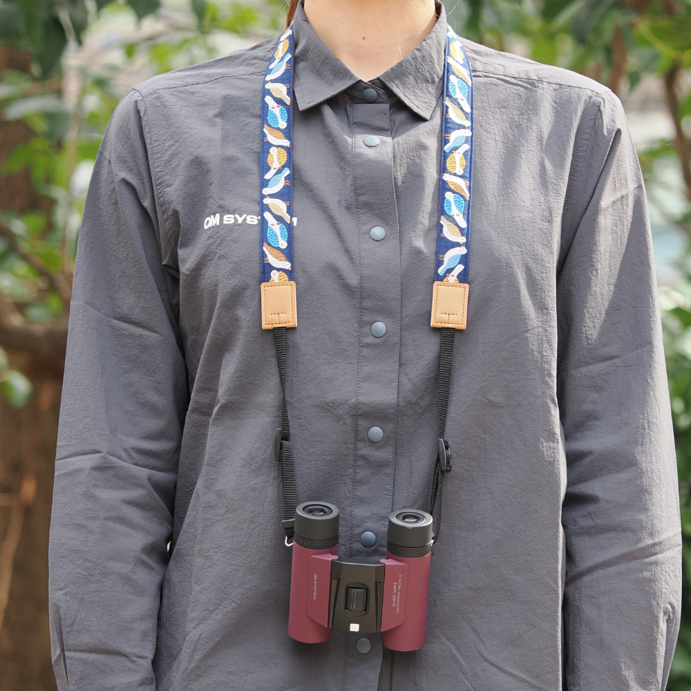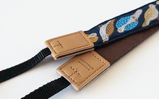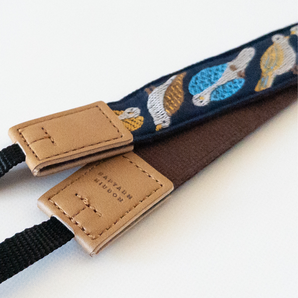 羽の部分に様々な模様のある鳥たちを描いた可愛すぎるカメラストラップ