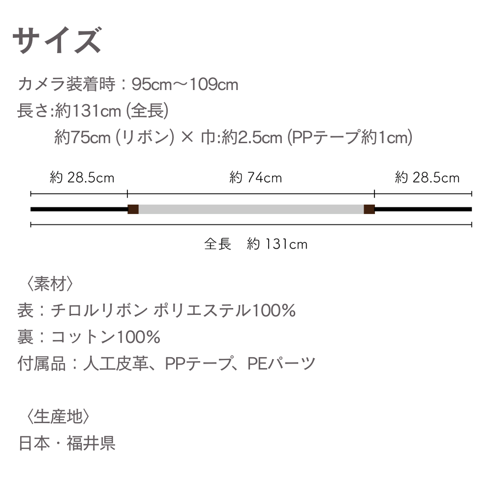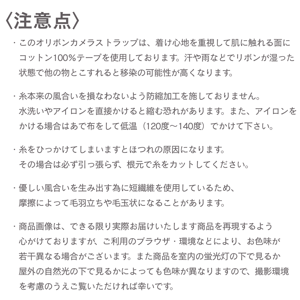 ・このオリボンカメラストラップは、着け心地を重視して肌に触れる面にコットン100%テープを使用しております。汗や雨などでリボンが湿った状態で他の物とこすれると移染の可能性が高くなります。十分ご注意ください。