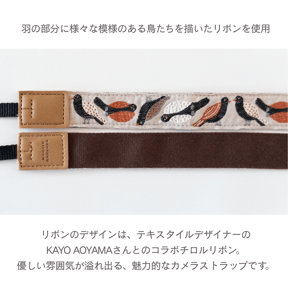 本製品は、テキスタイルデザイナーのKAYO AOYAMAさんとのコラボチロルリボンで作成したカメラストラップで、