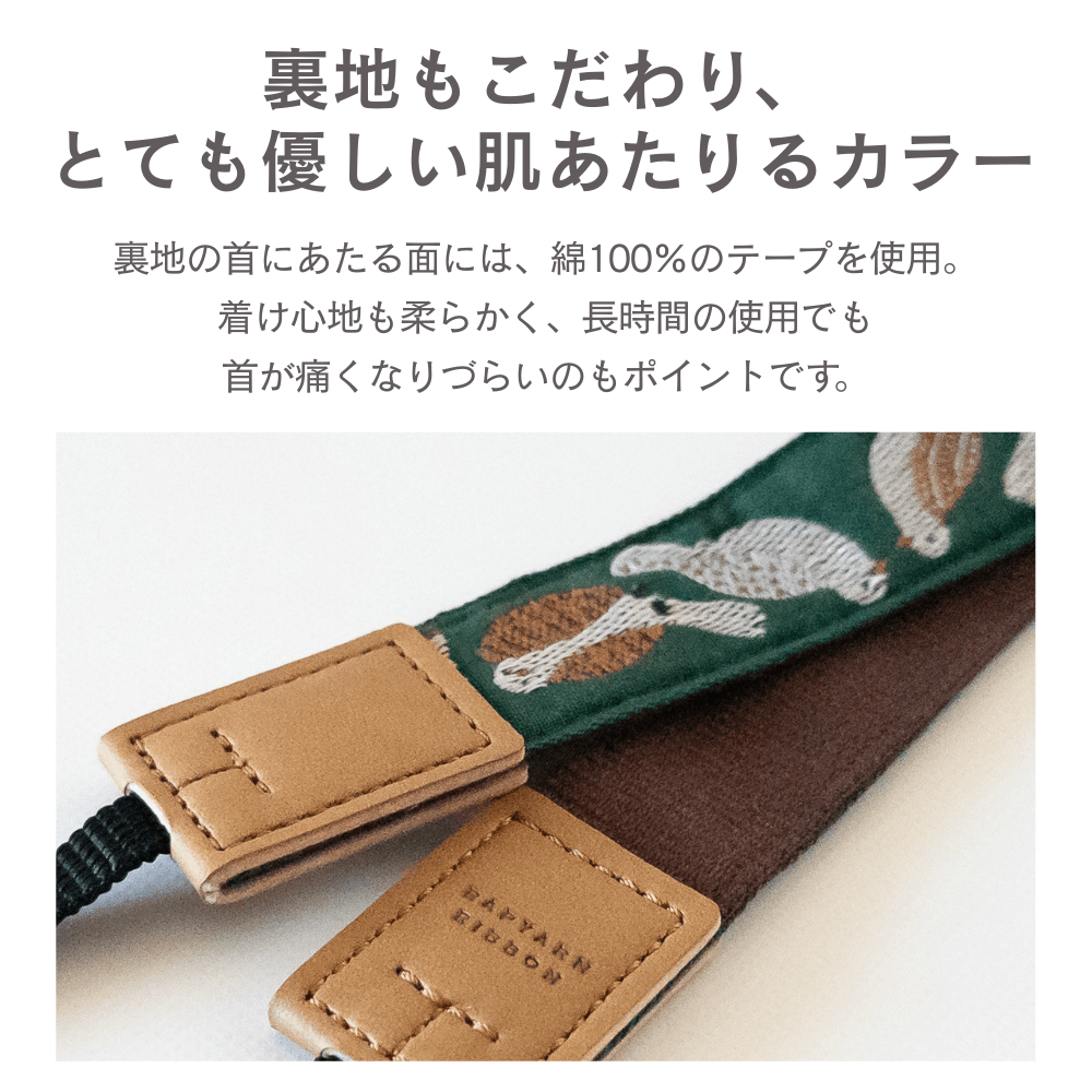 裏地の首にあたる面には、綿100%のテープを使用しているので、着け心地も柔らかく、長時間の使用でも首が痛くなりづらいのもポイントです。