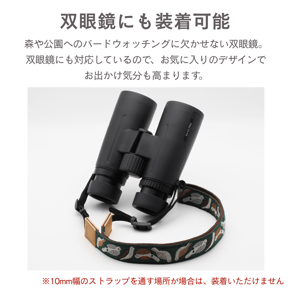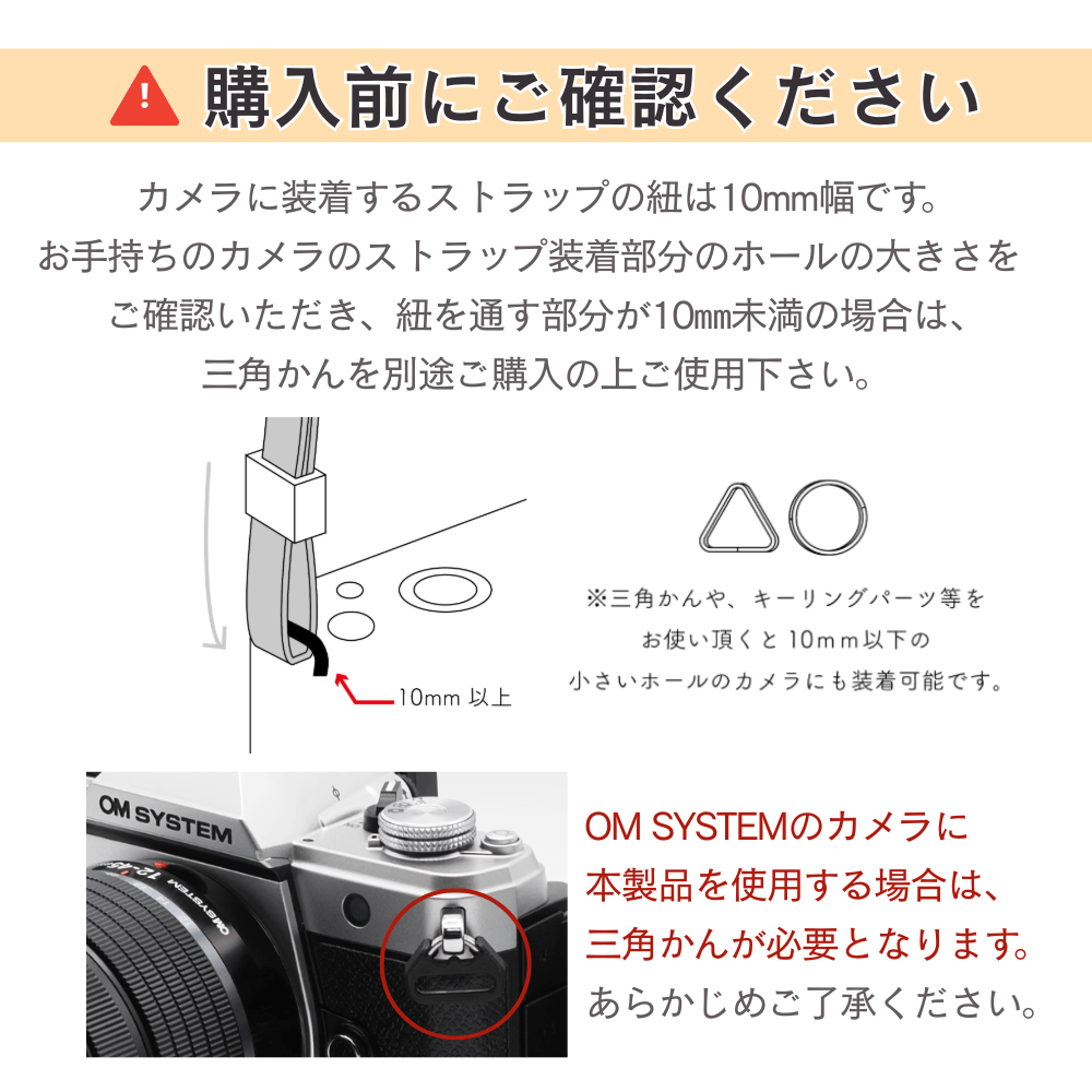 ・カメラに装着するストラップの紐は10mm幅です。お手持ちのカメラのストラップ装着部分のホールの大きさをご確認いただき、紐を通す部分が10㎜未満の場合は三角かんを別途ご購入の上ご使用下さい。
