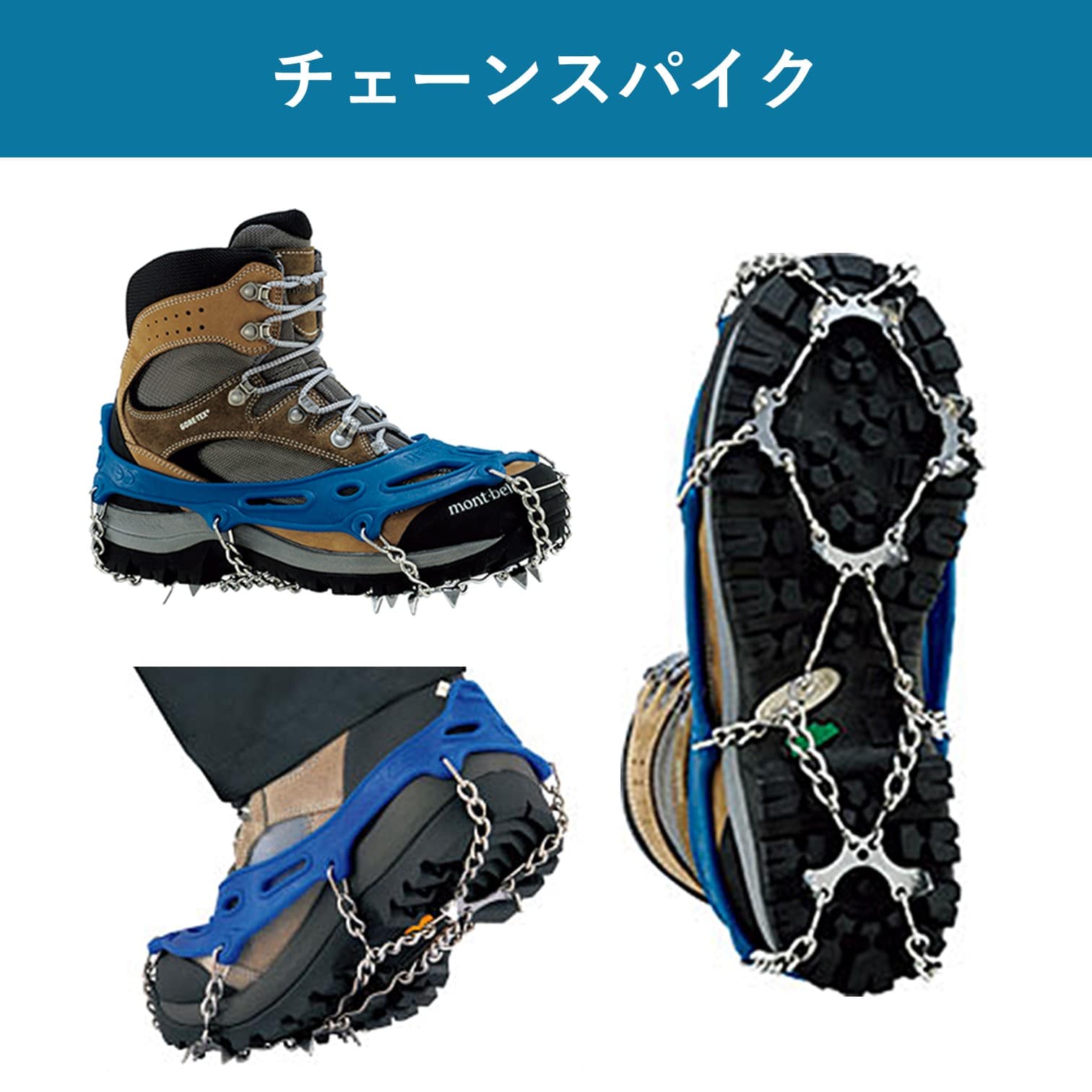 冬の低山や夏の雪渓歩きにピッタリなチェーンスパイクは、ブーツの上から靴下を履くような感覚で簡単に装着ができます。バンド部分には柔らかな素材を用い、さびにくいステンレス鋼を使用した爪をチェーンで連結させることにより、ブーツの屈曲に柔軟に追従。スキー靴などの硬めの靴から、底の柔らかい靴まで、幅広く対応します。軽アイゼンよりもコンパクトなので、いざという時の備えとして最適です。