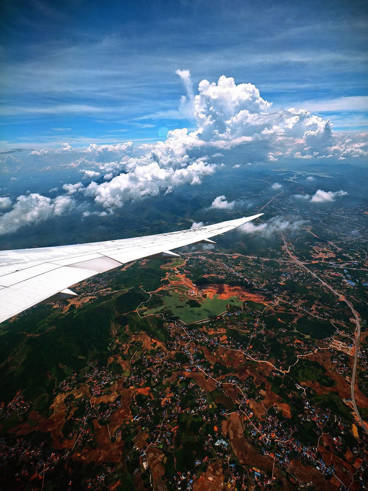 飛行機の機内からの一枚。私は関西国際空港からハノイ・ノイバイ空港で乗り継ぎ、シェムリアップ・アンコール国際空港へ。 総フライト時間10時間ほどかかるので飛行機の機窓からの撮影を楽しみながら過ごします。