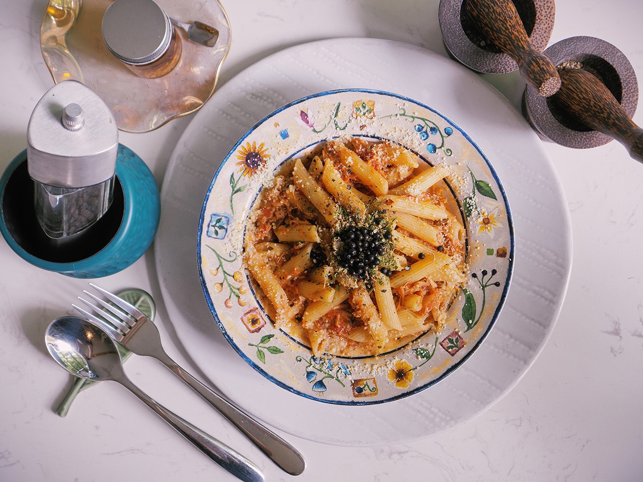 このアラビアータ、ちょっと何か違うと思いませんか?真ん中に黒い粒々が盛り付けられているのですが、これ「ペッパーキャビア」と呼ばれる「生胡椒の塩漬け」なんです。このペッパーキャビアはただの塩漬けではなく、若い胡椒(つまり胡椒の赤ちゃん)を塩漬けにしているので食感もプチプチしていてこれだけでお酒何杯も行けちゃいます。カンボジアは胡椒好きにとってまさに天国です。