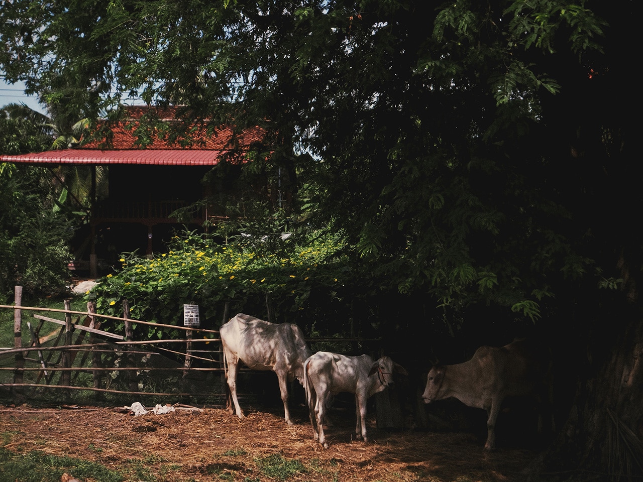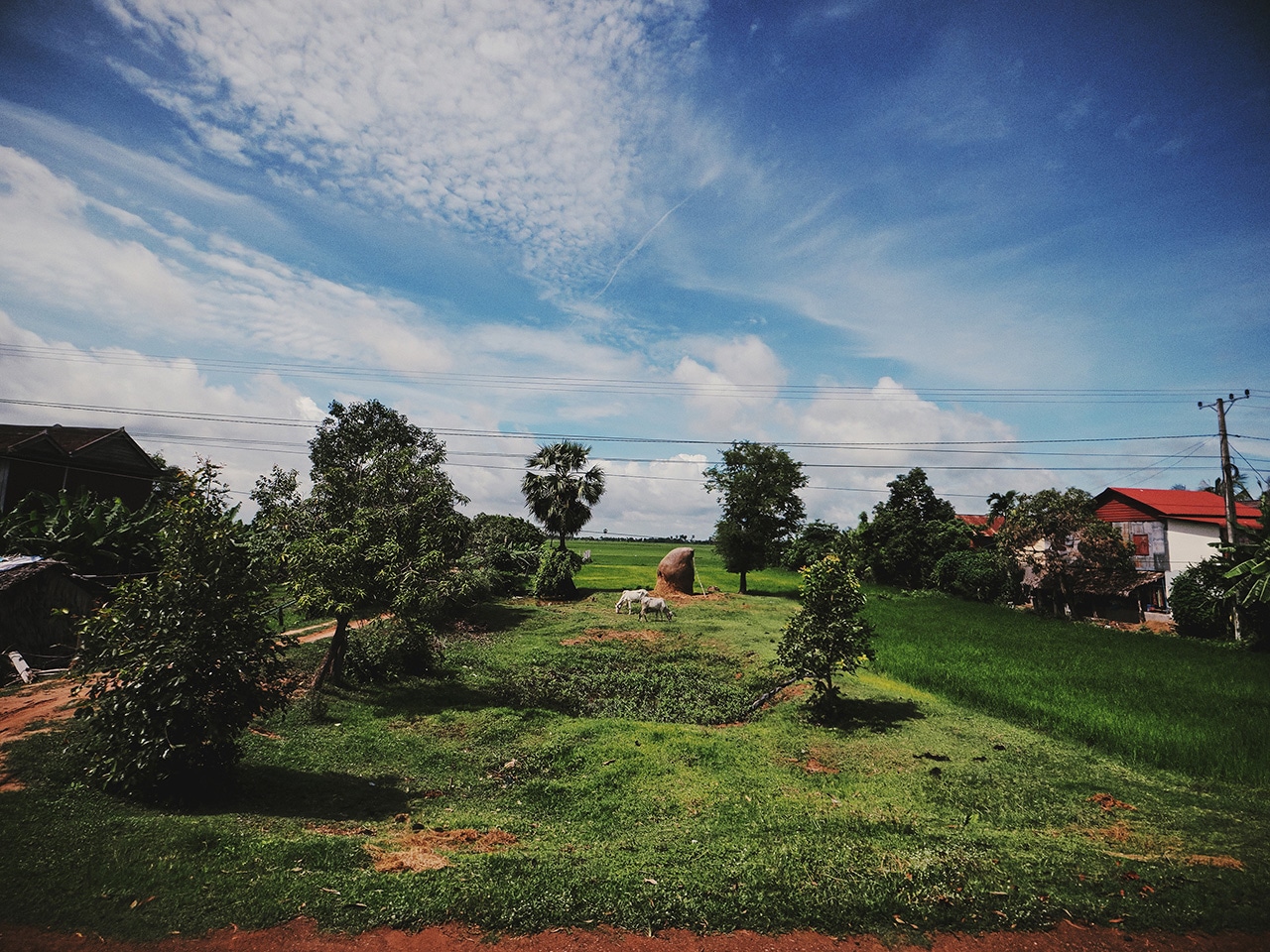 カンボジアにはたくさんの牛と犬がいます。カンボジアでは牛は財産として大切に扱われており、収入源や食肉用など大切に扱われています。車窓から景色を眺めていると「牛…牛…牛…犬、犬…牛…」と言う感じでひっきりなしに牛と犬が通り過ぎていきます。カンボジアは自然が多く緑が多い景色なので白い牛がいるといいアクセントになってくれます。遠くにポツンといてもよく目立ちます。まるで絵画のような景色ですね。