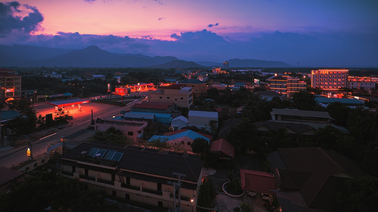 ホテルのバルコニーから見えるカンポットの町灯りと夕焼けのコラボが美しく、あわててOM-5 Mark IIを持ち出して撮影しました。