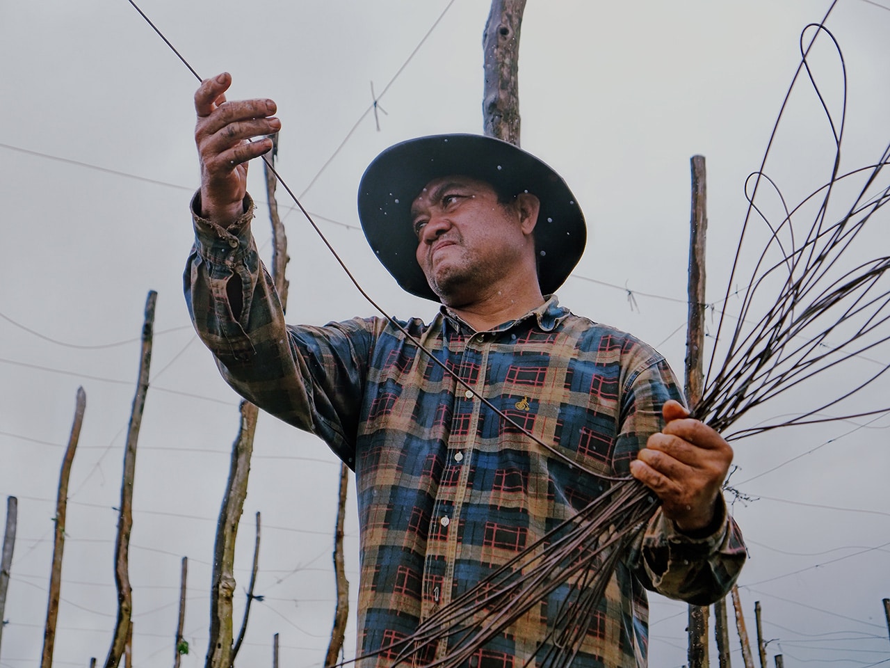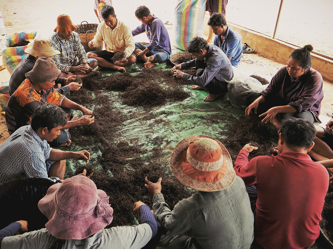 胡椒畑に到着すると既に職人さんたちが集まって作業をされていました。 私が訪れたタイミングは胡椒畑のオフシーズンだったため収穫も終わり次の収穫に向けての準備の真っ最中でした。 この写真は胡椒の実の軸の部分を乾燥させた加工品「胡椒茶」を職人さんたちが手作業で作られているシーンを撮らせていただいたものです。