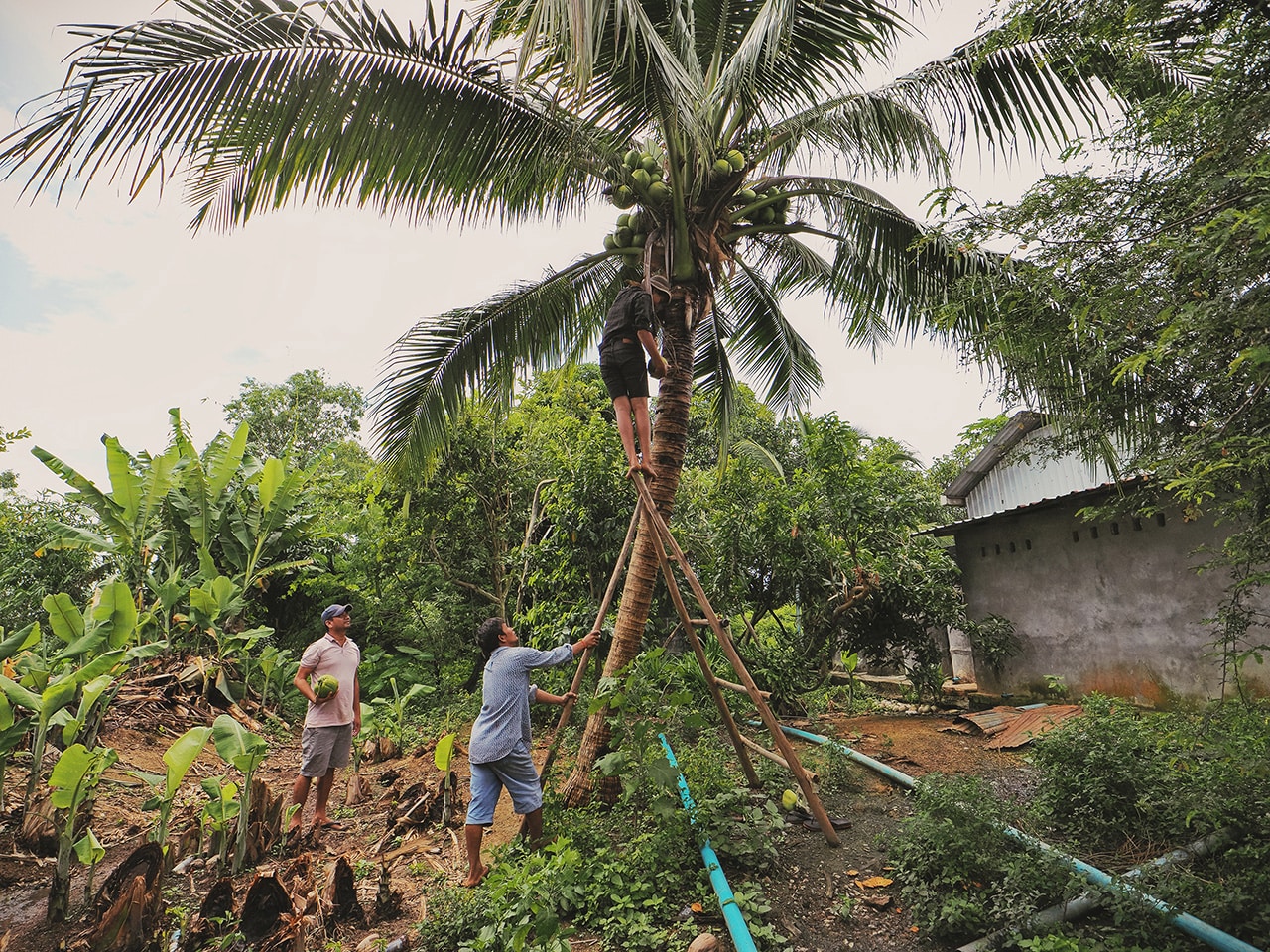 気がつけば時間はお昼。職人さんたちも休憩時間に入ります。一人の若い職人さんが手作りの脚立をつかってヤシの実を取ってくれました。胡椒畑では色々なものが手作りです。自給自足が当たり前で毎日がキャンプのようです。