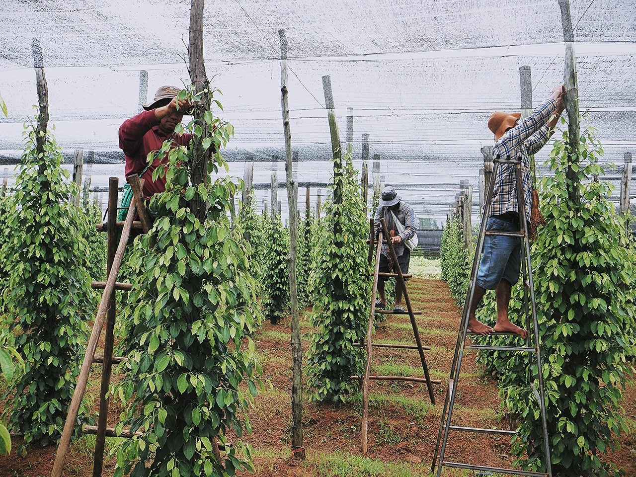胡椒畑の上空には黒いネットが張り巡らされています。 このネットは直射日光の軽減や胡椒の木に雨が直接当たらないようにする効果があるそうです。上から強い雨が当たると胡椒の実が落ちてしまうこともあるそうなのでこの黒いネットはとても大切な役割があるんですね。