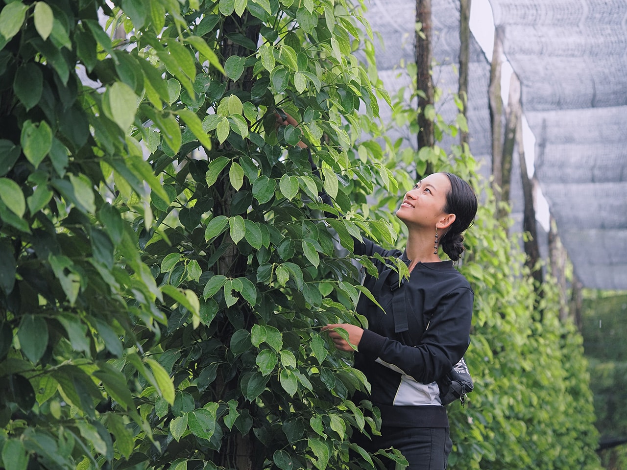 レイナさんが胡椒の生育状況を確認します。同じ胡椒の木でも毎年生育状況は違ってきますし、 毎年風味も変わるので本当にワインのようですね。