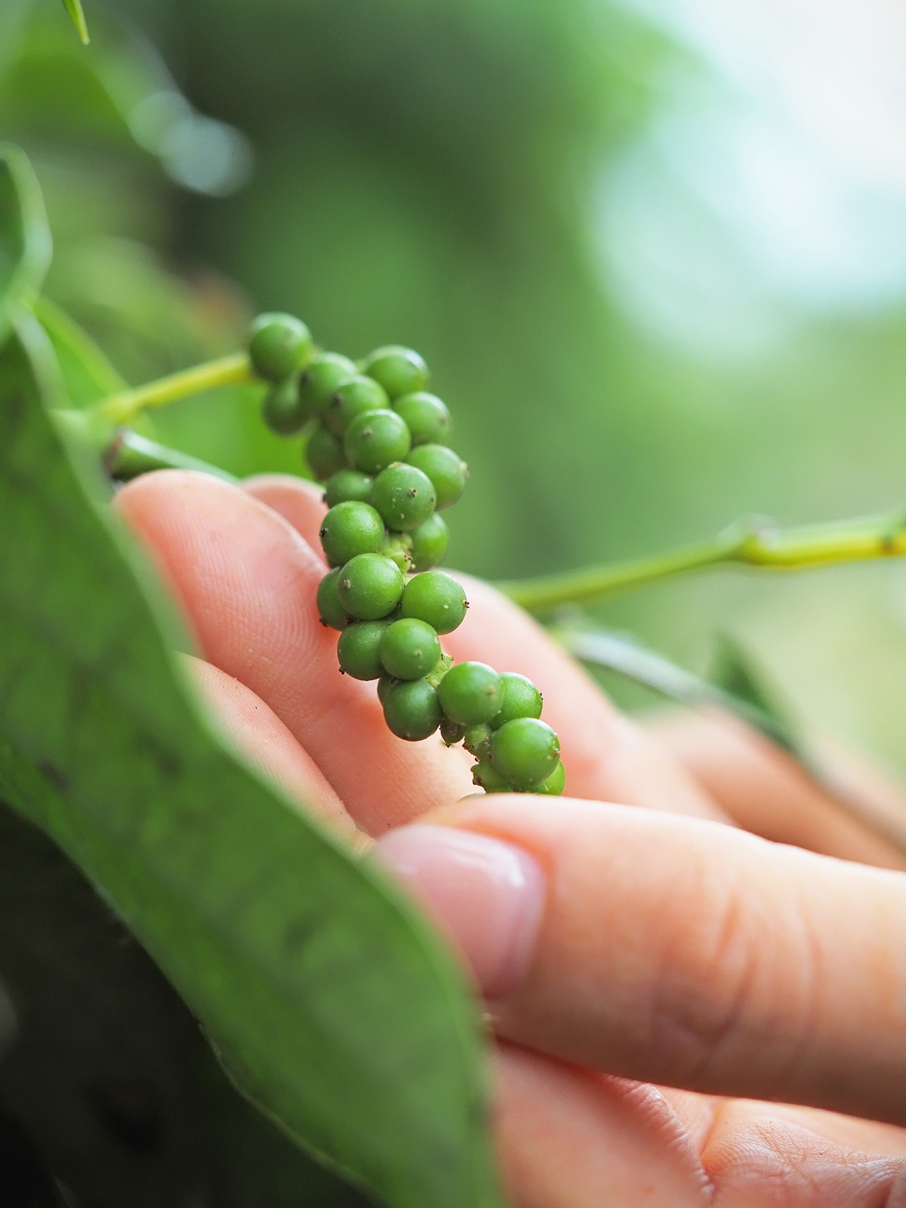 多くの人は生の胡椒の実を見たことはないと思います。私も写真や映像でその姿は見たことがありますが自分の眼で見るのはこの旅が初めてでした。 胡椒の実はまるで葡萄のような房状で綺麗な緑色の粒がギュッと凝縮された状態で実っています。顔を近づけるとほのかに青味を含んだ胡椒の香りがします。 カンボジアでは生の胡椒を食べる習慣があるので私も一つ採れたての生胡椒をいただきました。 日本では塩漬けはあっても滅多にお目にかかれない本当の生胡椒。