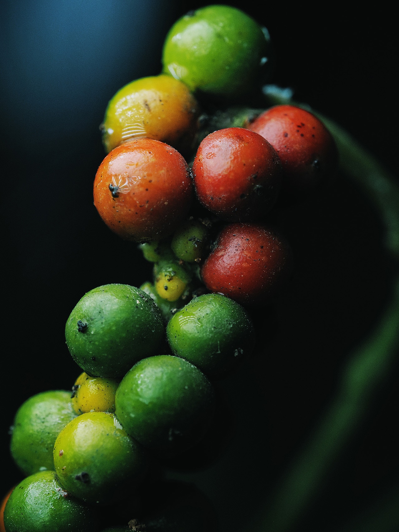 胡椒の実の房をよく見ると緑だけではなく赤い実がついているものも見られます。 これ、完熟した「赤胡椒」なんです。もしかしたらポテトサラダとかに入っているのを見たことある…という人もいるかもしれませんが、あれは実は胡椒ではなくウルシ科の植物なんです。 この赤胡椒は完熟胡椒でありフルーティーさと柔らかい辛みが特徴です。ちなみにこの赤胡椒の皮を取り除くと「白胡椒」になります。 実は黒胡椒、白胡椒、赤胡椒は全て同じ胡椒から作られているんです。収穫のタイミングや加工の仕方で胡椒の特性が変化するということになります。