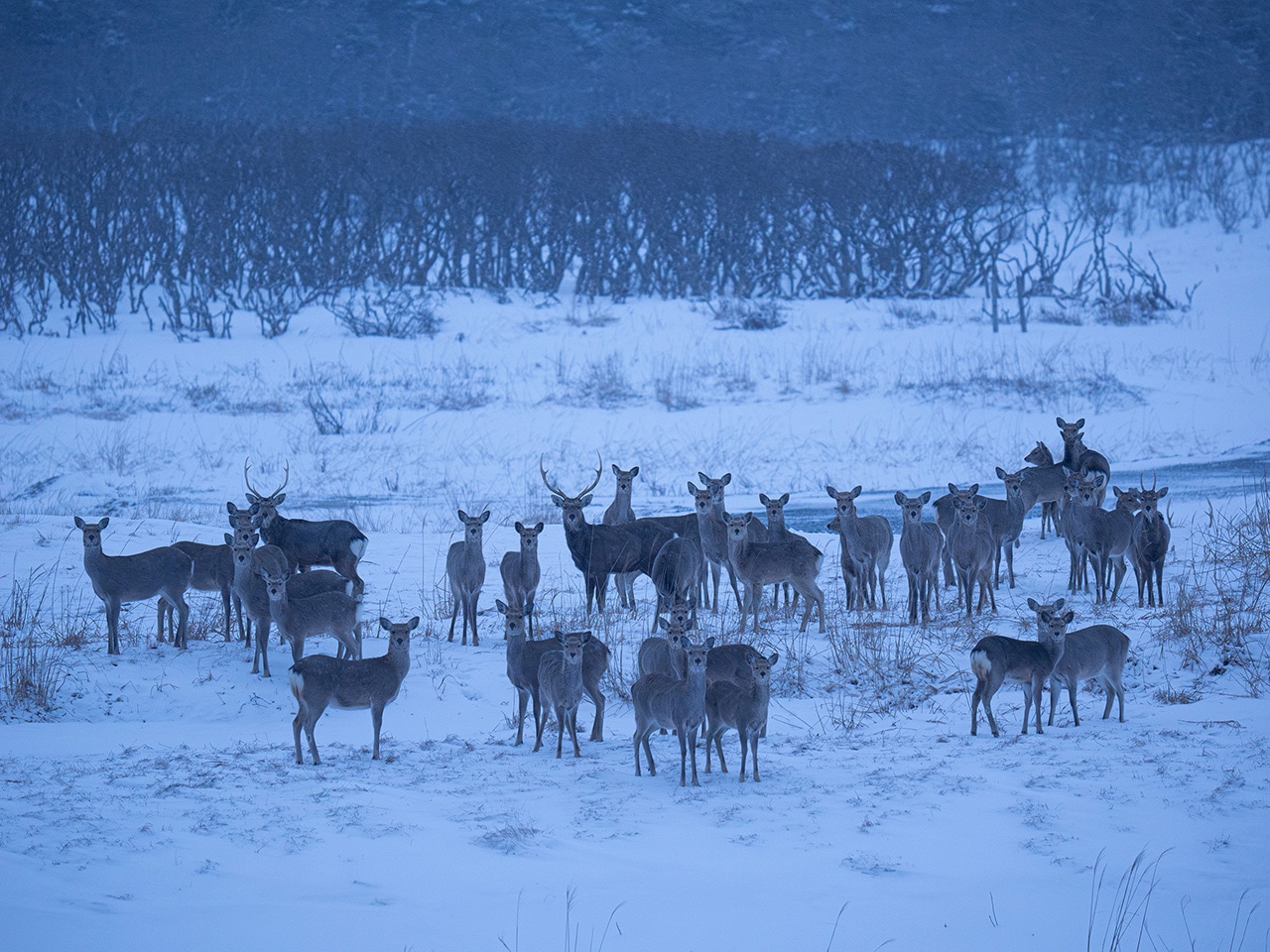 夕暮れが迫るころ、雪解けが進む海岸線に出て来たエゾシカの群れ。