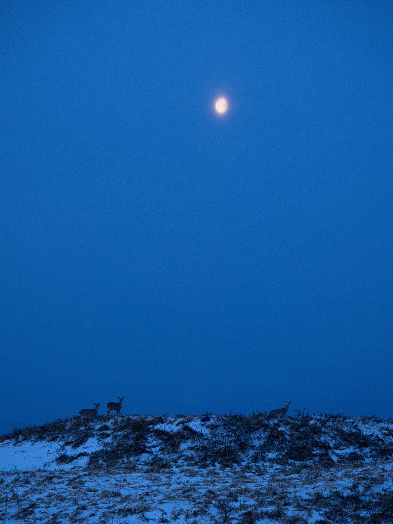 闇の中のエゾシカを月と一緒に捉えた。このようなシチュエーションは一瞬の勝負なので三脚を立てている暇はなく、手持ちでの撮影が多い。5軸シンクロ手ぶれ補正の本領発揮だ。F2.8とF値が明るいためISO感度を過度に上げることなくノイズを抑え、シャッター速度を稼ぐことが出来る。
