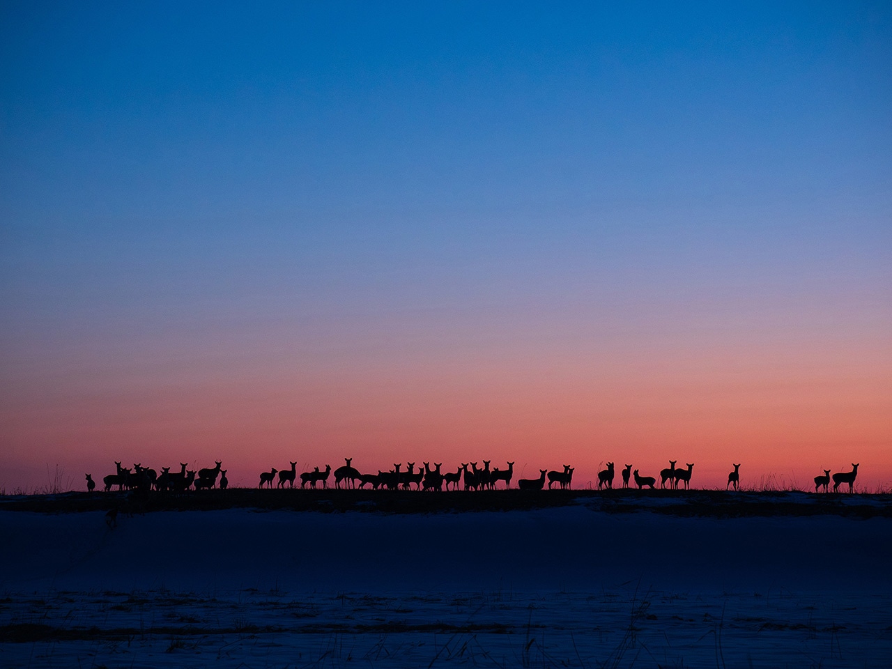 夜明けのマジックアワーとエゾシカの群れ。空を広くあけ夜明けのグラデーションを表現し、エゾシカの群れを入れるため、広角側の50mmで撮影した。とっさに画角が変えられるズームレンズは撮影に幅を広げてくれる。