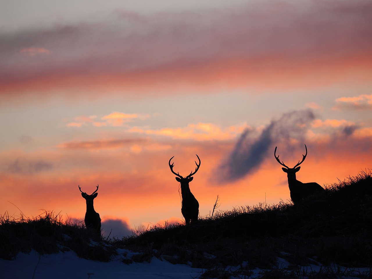 望遠側の200mmで撮影し、夕焼けに浮かびあがるエゾシカの立派なトロフィーを強調した。