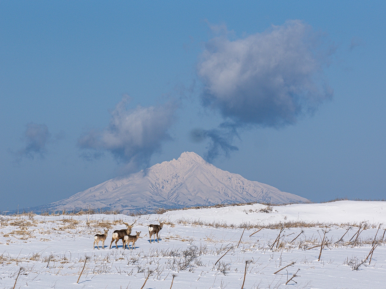 似たようなエゾシカと利尻富士のシーンだが、焦点距離(画角)により印象が異なる。