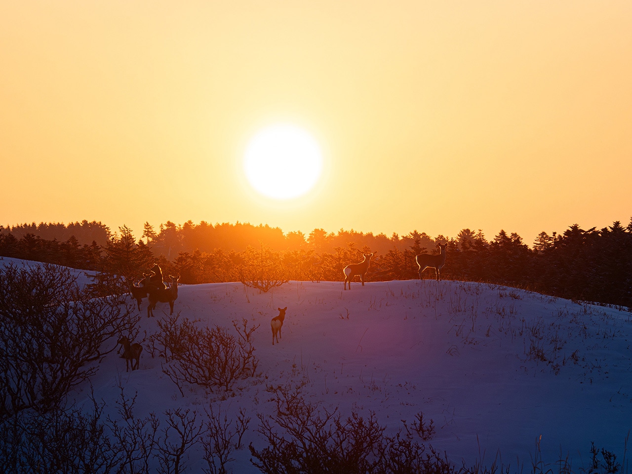 夜が明けると鹿たちは山奥へ帰っていく。朝陽を浴び鹿たちが浮かびあがる。