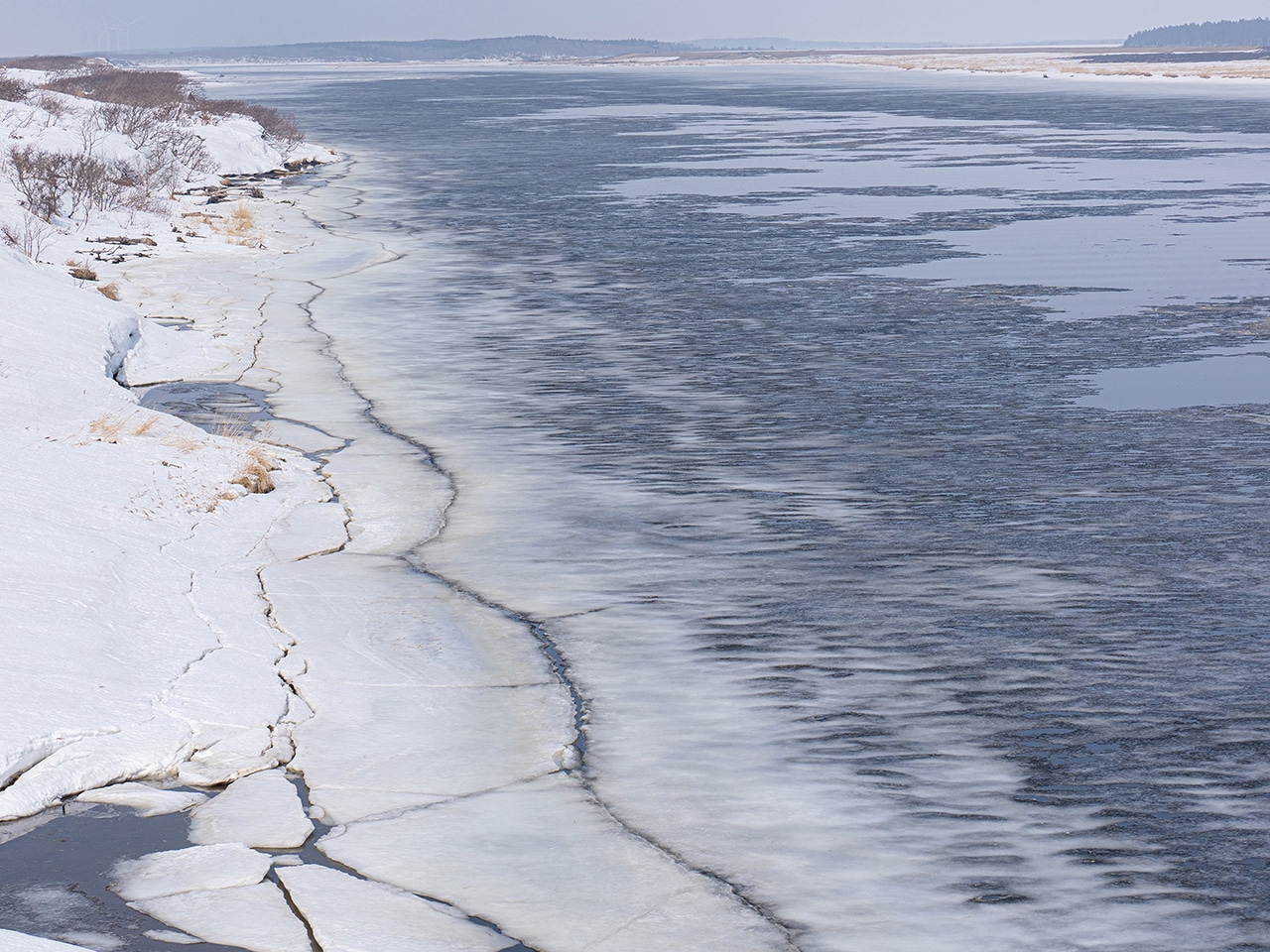 暖気が続きエゾシカが自由に行き来していた大河の氷が溶け始めた。