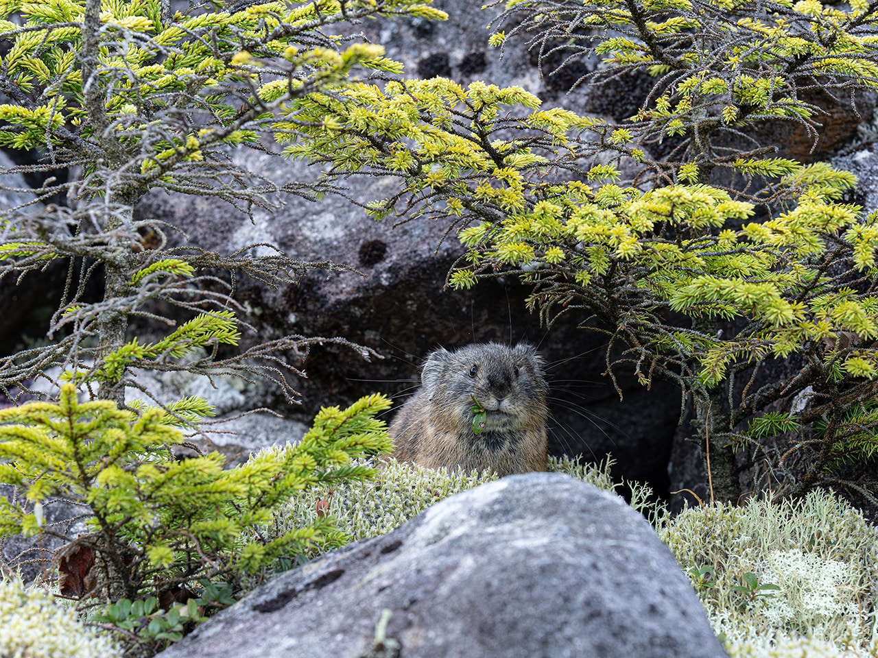コケモモの葉を咥えワイルドなエゾナキウサギ。木々に囲まれて難しい条件であったが、つぶらな瞳のナキウサギの目にAI被写体認識AF(動物:犬・猫)でバッチリとピントが合う。