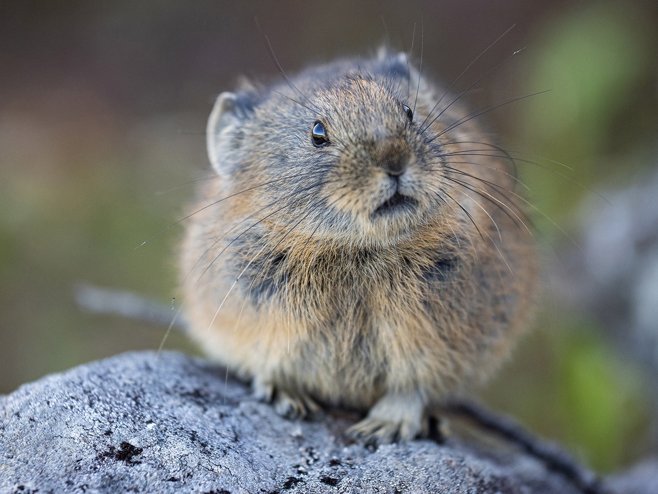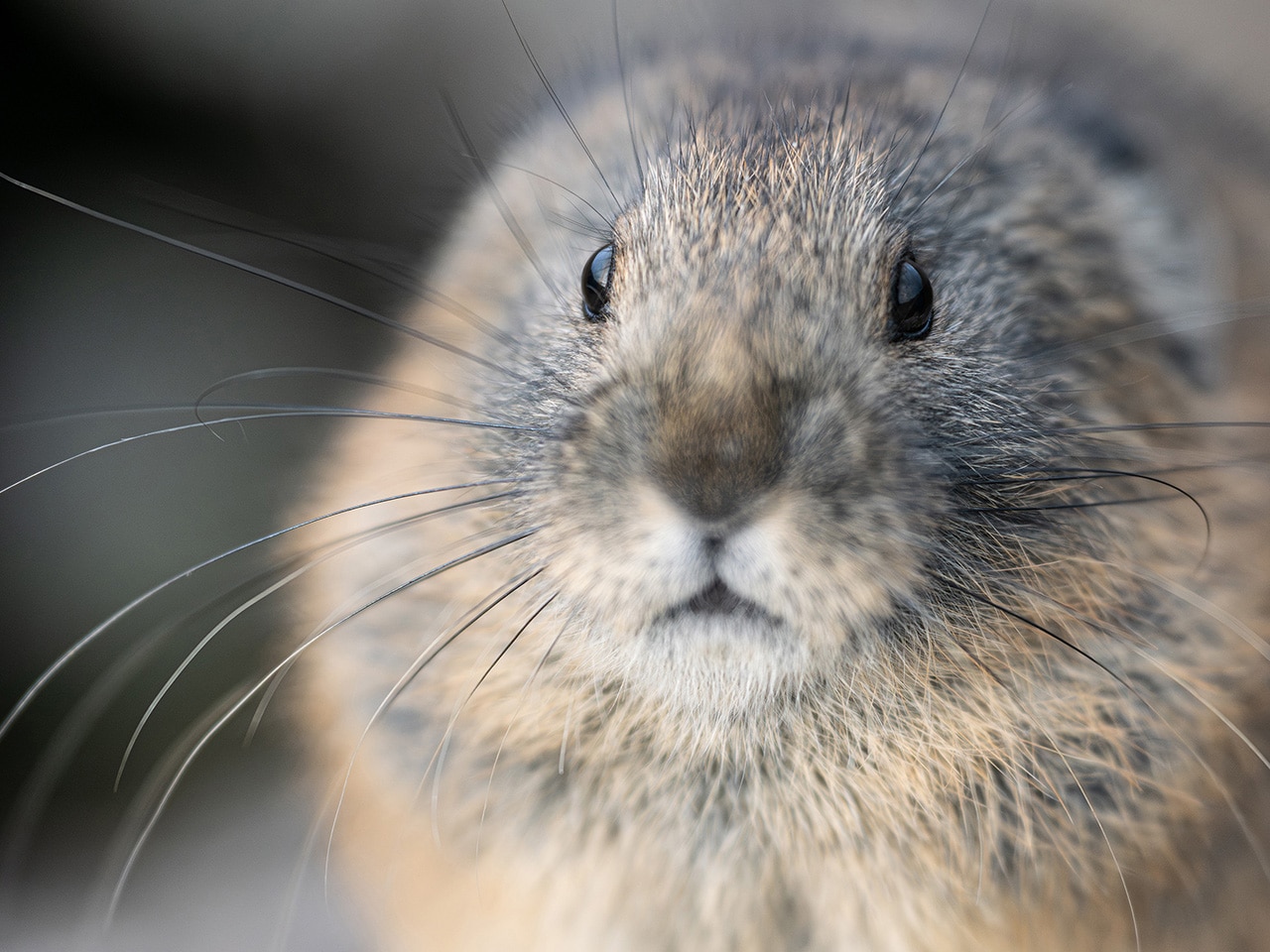 目の前に現れたエゾナキウサギ。撮影最短距離が短いおかげで至近距離に現れても、その場を動くことなく撮影できた。ものすごい解像感で目の中に風景も映り込んだ。
