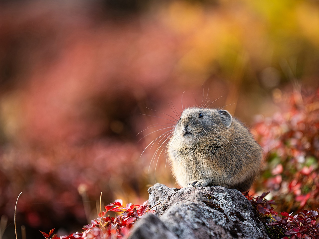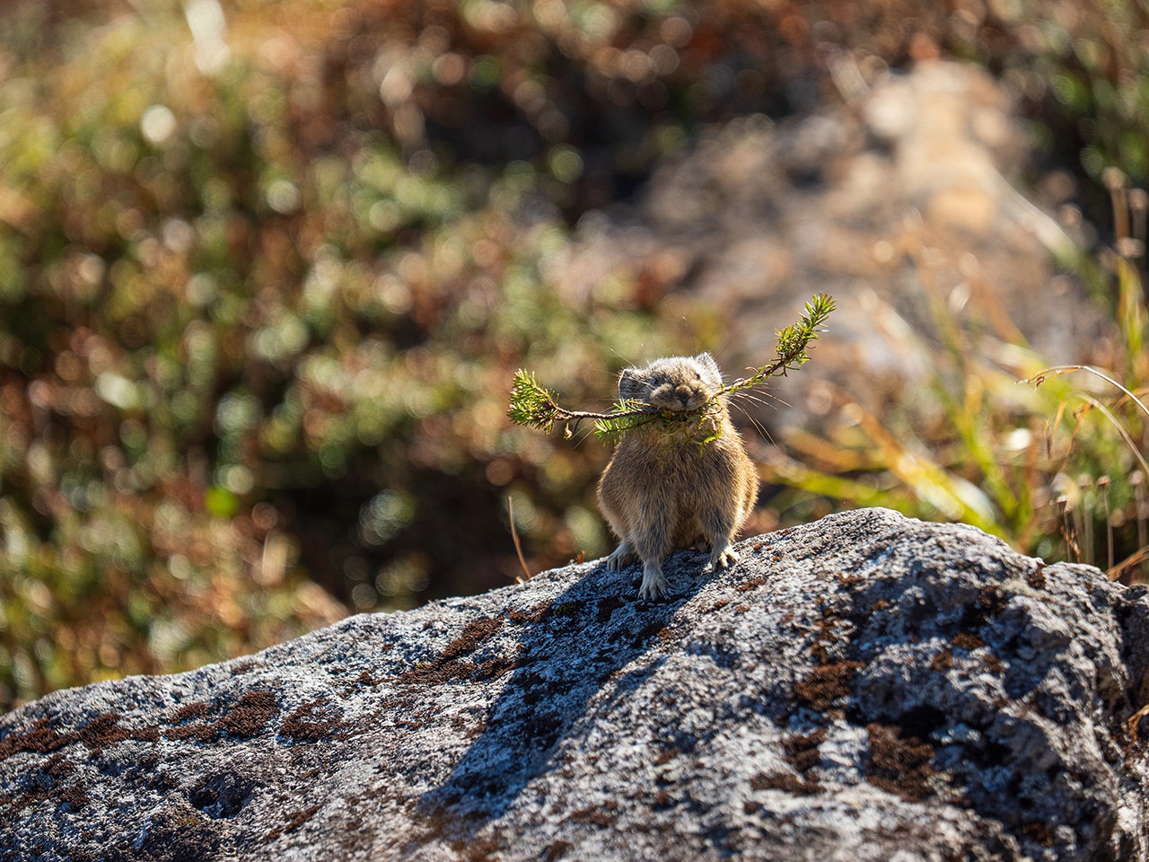エゾナキウサギは名前の通り鳴くウサギだ。「ピチュッ、ピチュッ」と遠くまで響き渡る声で鳴く。背景に山々の風景を入れて開放で撮影し、主役を浮かびあがらせ、なおかつ生活している雰囲気まで伝わる写真に仕上げた。