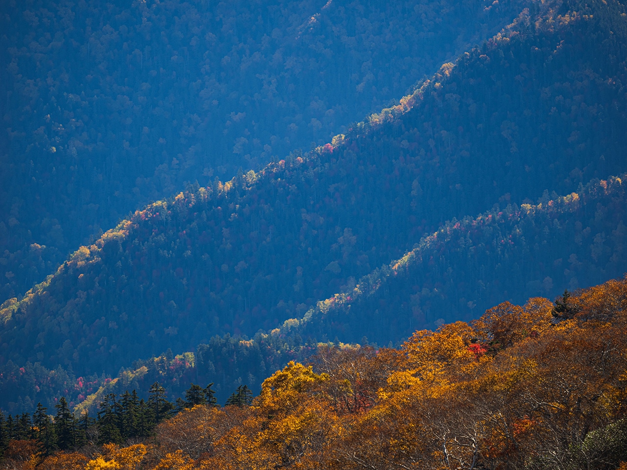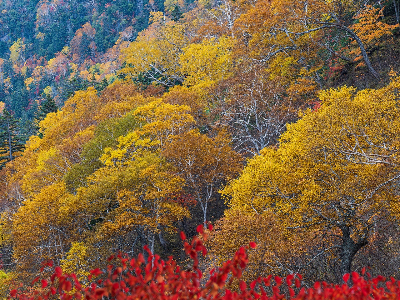 形が良く黄葉がピークとなる木を選んで切り取った。望遠で撮影すると情報量を減らし、主役をより強調できる。最大7.0段相当[1]、ボディーとの5軸シンクロ手ぶれ補正に対応した当レンズだからこそ、広角側や望遠側でも気軽に手持ちハイレゾショットが撮影できる。足場の不自由な場所が多い山岳地帯では、とてもありがたい機能だ。