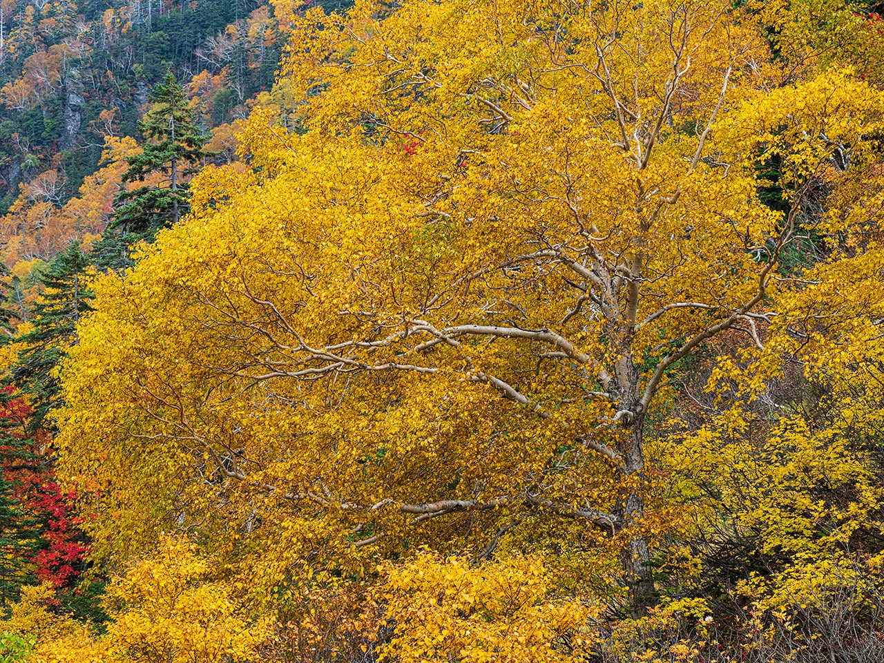 高山帯に多いダケカンバの黄葉。白い幹がアクセントとなる。