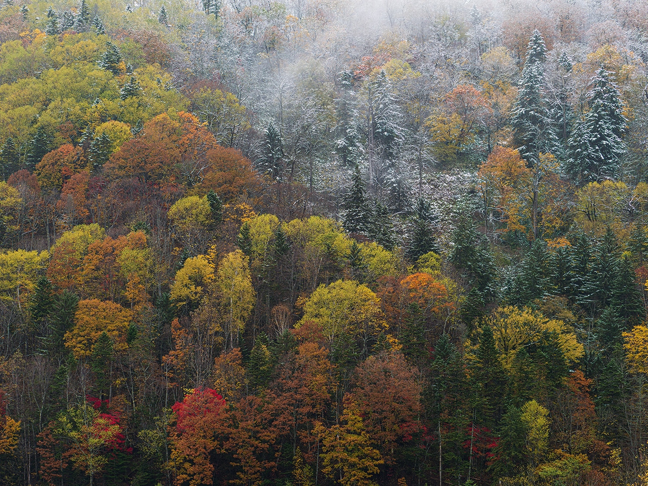 紅葉のピークに初雪となった。山の上から冬が迫る季節の巡りを表現した。