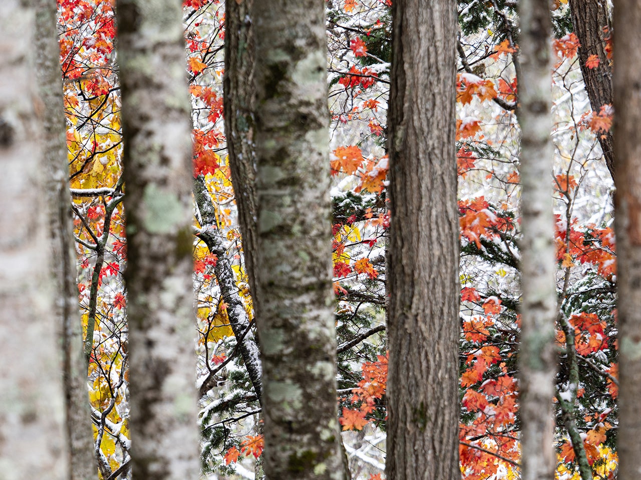 絞り値F2.8のボケを生かし異なる木の幹の模様と、奥に鮮やかな雪紅葉を配置し絵画のように仕上げた。大口径レンズだからこそ表現できる世界だ。