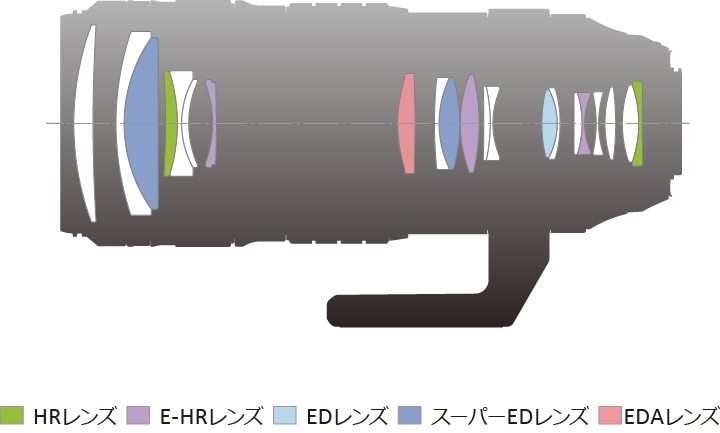 | レンズ構成 | 13群21枚 (EDAレンズ 1枚、スーパーEDレンズ2枚、EDレンズ1枚、HRレンズ2枚、E-HRレンズ3枚) 前玉フッ素コート:有り ZEROコーティング:有り ZEROコーティング2:有り |