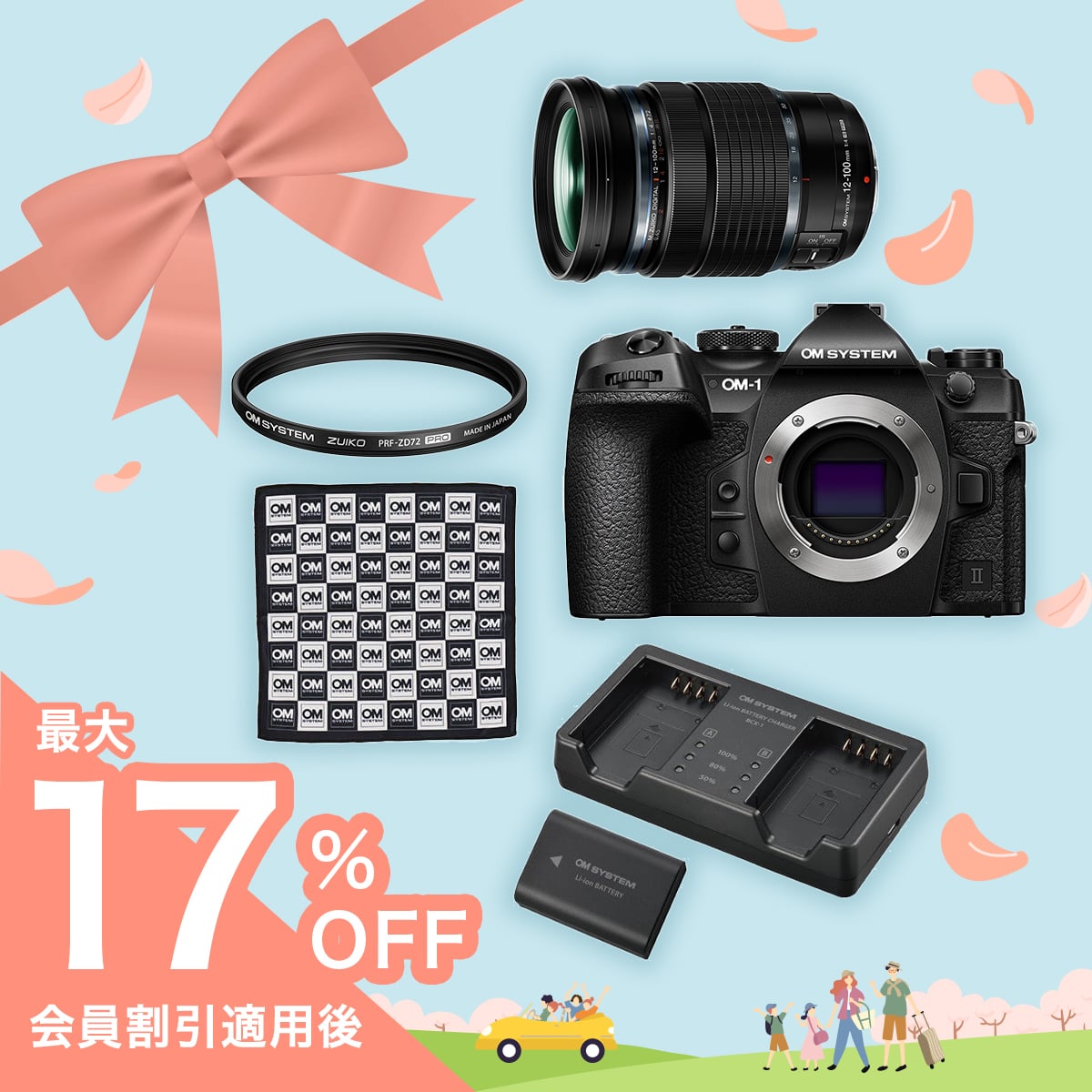 唯一無二、フラッグシップモデル「OM-1 Mark II」に、神レンズと名高い「ED 12-100mm PRO」と、予備バッテリーを付けたお得なセット。