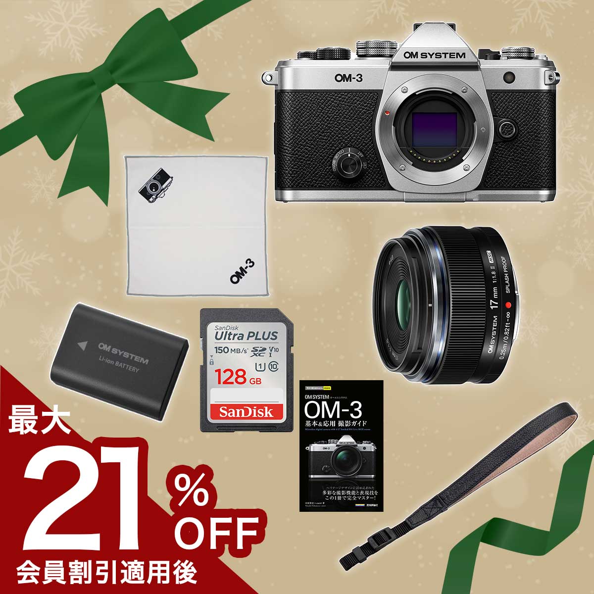往年のフィルム一眼レフカメラ調の普遍的な美しいデザインにフラッグシップカメラ同等の機能を搭載した「OM-3」に、気軽にスナップ撮影が楽しめる「17mm F1.8 II 」を付けたお得なセット。